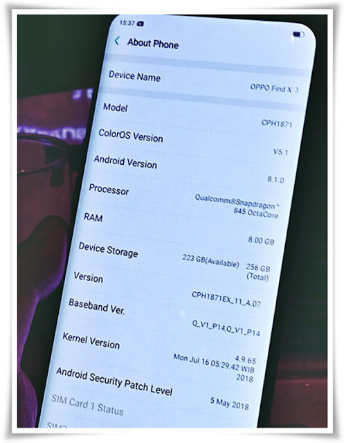 Jadi saya langsung cek dapur pacunya OPPO Find X, dan ternyata OPPO Find X sudah menggunakan chipset Qualcomm Snapdragon 845 yang dipadukan dengan RAM 8GB. Sementara untuk mendukung fungsi tampilan grafis yang rumit; performa OPPO Find X juga menjadi sangat bisa diandalkan berkat keberadaan GPU Adreno 630.